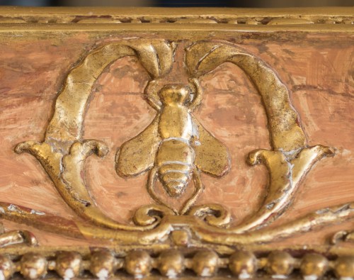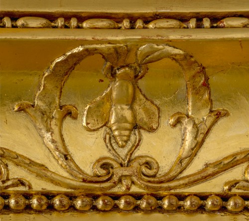 The bees on all three of the frames shown above may be based on the same source as a decorative motif from Jacob-Desmalter’s lit de parade at Fontainebleau, made for the emperor slightly later (in 1809), and striking in its fully-realized naturalism. The bee is in the same position, but is much more 3-dimensional and undercut; it has segmental legs, eyes, veined wings, and is covered in fur. The two honeysuckle flowers are replaced by little pineapples, as shorthand for a cornucopia. This bee is carved and gilded, rather than moulded, explaining its sculptural, plastic qualities; it was executed several years later than the plaster bees on the frames, arguing that both may derive from the same set of ornamental engravings, or possibly from drawings provided directly, perhaps by Percier and Fontaine.