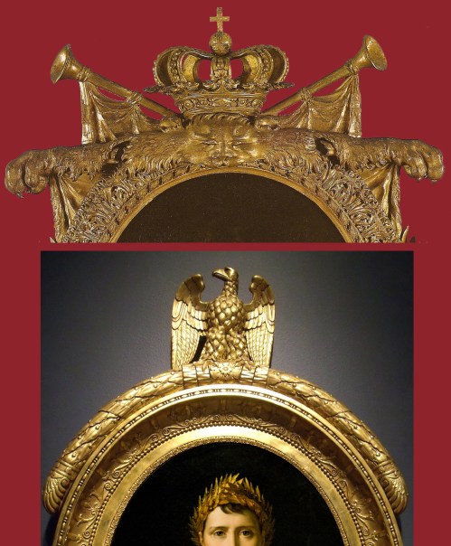 The most remarkable contemporary example of this pattern is the oval trophy frame on Gérard’s portrait of Napoleon in coronation robes, at the head of this article. It has been regilded several times, and has recently been undergoing restoration in order to be included in an exhibition of 2018, Napoleon: the Imperial Household [19].