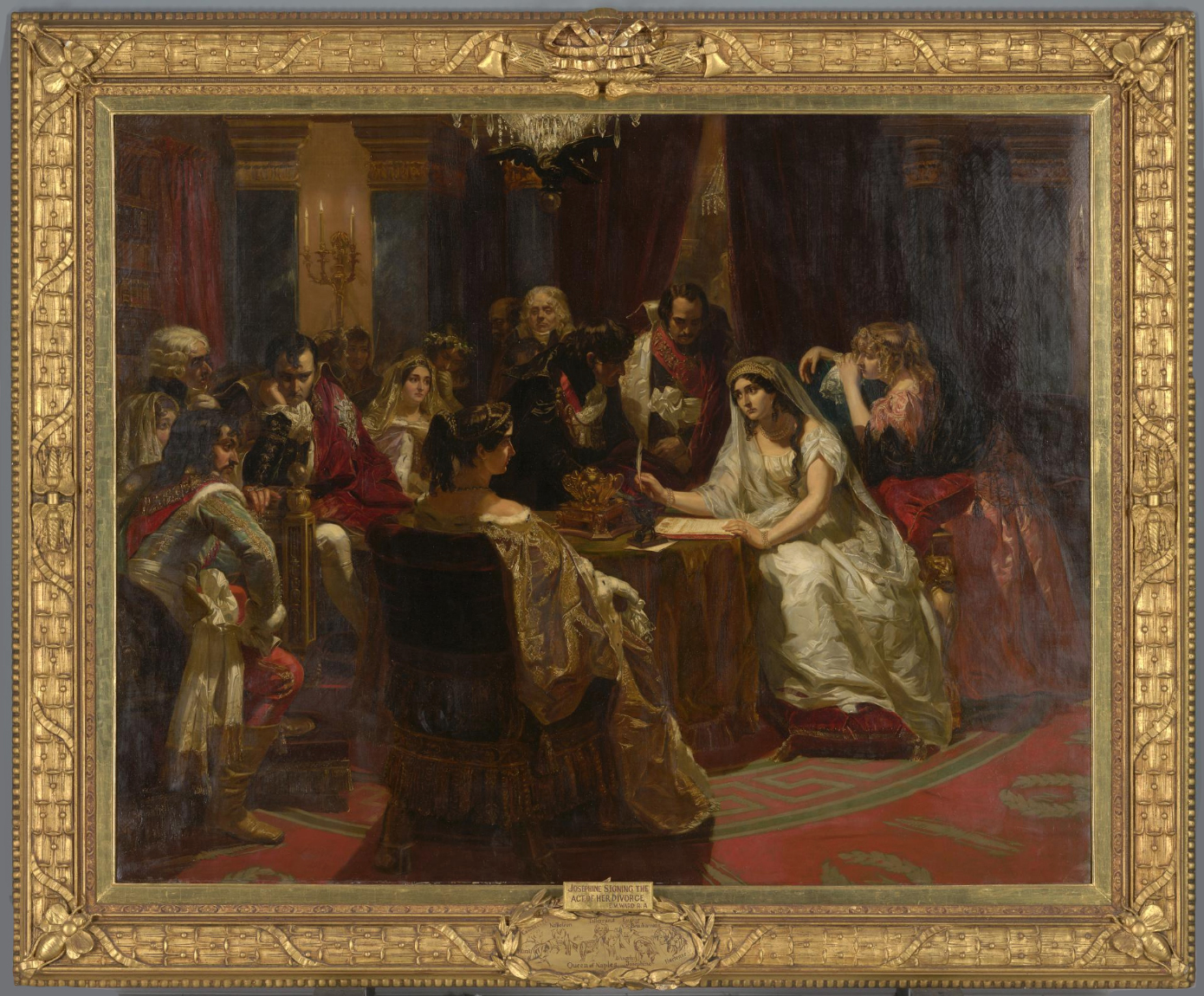 Holly McGowan-Jackson has written an essay on the trophy frame of a British painting in the Gallery’s collection, E.M. Ward’s Josephine signing the act of her divorce, which can be read online. The frame is interesting for its use of Napoleonic emblems in an historical context (the painting dates from 1853); these include large bees in the four corners, thunderbolts at the top and lateral centres, and axes in bundles of fasces, also at the top. The cartouche with a key to the characters depicted is set in a wreath of bay leaves.