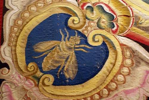 A later use of the bee and bay leaf wreath is found in a decorative tapestry portière, again presented as though framed in a carved and gilded cassetta, with plain ‘convex’ and stepped mouldings, accented with astragal-&-double bead, and a fantastic scrolled device holding the pictorial oval, and centred on a gilded bee at top and bottom. The frieze holds a gilded braid of leafless branches and bay leaf garlands, interrupted at intervals by wreathed golden bees.