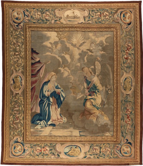 This particular work is a reminder of how frequently tapestries are composed with borders which replicate carved frames – they use architectural ‘mouldings’, sculptural ornaments, and corners and centres, all of which are often coloured in shades of gold – thus presenting the woven pictures or emblems they contain as integral framed works of art, complete in themselves and needing no other setting to display them on a wall.
