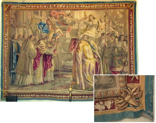 A final set of tapestries, made late in the productive life of the Arazzia Barberini, is a cycle of ten based on the life of the Barberini pope. These were designed for the hall of the Palazzo Barberini, and were on such a grand scale that the looms in the manufactory could not cope with them. The tapestries were woven as shown above (top), and then detachable framing borders were woven separately – framing side ‘pillars’ (lower image – another is in the Philadelphia Museum of Art), inscribed panels to go above the main pieces, and ‘predella’ panels to go below. The borders on the main tapestries are thus vestigial inner frames, with a narrow vine-leaf frieze defined by a flat outer fillet and a cotton-reel moulding at the sight edge. The Barberini bees are much more subtly present in this cycle; single golden insects crawl across the corner cassettes, and the pilaster tapestries also contain single gilded bees on the architectural pillars imposed on the background panels. All these details are created to produce the effect of large trompe l’oeil frames.