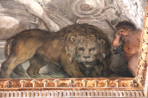 There are related frames of the interior architectural kind which also sport bees; for example, surrounding and containing the operatic perspectival fresco, The Triumph of Divine Providence, painted by Pietro da Cortona on the ceiling of the great hall in the Palazzo Barberini. As with the tapestries, the ceiling has been given a picture frame-like border: a parcel-gilt stucco confection of ornamented mouldings, including egg-&-dart and fluting, with an innermost frieze decorated with repeats of four lilies and a bee. These motifs are probably barely visible by the naked eye when seen from the floor, particularly in conjunction with the tangle of striving, flying, falling, pushing and jostling bodies which cluster above them and throng upwards, breaking through the barrier of the plaster ceiling to riot in the apotheosis of the divinely provident heavens. The impression of the little stucco bees must be subtle, subliminal; reinforcing the message of the three gigantic golden bees in the central section of the painting. Perhaps their relationship with the four lilies is to create and then interrupt a short rhythmic chord, adding to the drama of the whole.