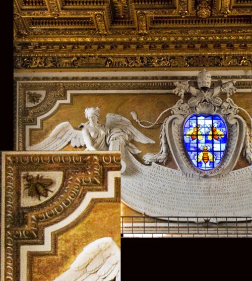 The bees in Santa Maria in Aracoeli are rather larger and more visible. The west wall of this church features a vast architectural frame in white and gold egg-&-dart, containing a eulogy of Pope Urban VIII inscribed on a sweeping scroll supported by two angels. The centre of the scroll supports in its turn a scrolling, fluted Mannerist frame, carrying the papal mitre and keys; the frame is pierced by a stained glass window where the Barberini bees frolic again in an ultramarine and azure sky. The corners of the outer architectural frame are shaped, and gilded stucco bees, the size of the glass bees, have alighted on fan-shaped white fields to which the eye is inevitably led, from the curved top edge of the scroll. Pope Urban has, in effect, claimed the whole width of this wall for his own, and stamped it repeatedly with his impresa.
