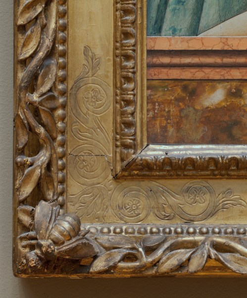 This is a Baroque cassetta, with a pierced and undercut running branch of bay leaves and berries carved out of the convex top moulding, with four very sculptural bees in the corners; a butt-jointed frieze engraved with scrolling foliate and floretted corners and centres; an astragal-&-double bead, and a bird’s beak moulding ornamented with stopped channel fluting. The spandrels have further incised floral motifs. It is a decorative and not unsuitable frame, given that the panel has been removed from its native altarpiece; however, the symbolism of bay leaves and bee as associated with Christ has little application here. This bee is simply the family emblem of a collector (even though an ecclesiast), and the bay leaves, which might be thought vaguely appropriate for the Resurrection (victory), are not really symbolic of the Lamentation. The frame can be seen purely as conveying the stamp of ownership onto a piece of art; and probably as an indication that there must have been many similar examples in Antonio Barberini’s collection. It is interesting that on the frames which seem to belong to Urban’s pontificate, the bees point inwards towards the pictorial image (whether painting or tapestry), but in this frame, which seems to have been commissioned by the pope’s nephew, they point outwards.