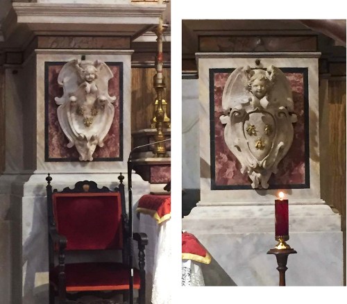 One of the most decorative features is thus the band of marquetry in the predella panel, across the bottom of the frame, and the corresponding inlaid imprese on the pedestals of the columns. Here the bees are represented (beneath a marquetry cardinal’s hat) in different coloured woods – whispering, rather than shouting like some of the tapestry, painted, carved and moulded stucco bees which flutter through the rest of this article. They are all Barberini bees, however; bees belonging to three different members of the family, and showing an amazing variety and inventiveness in their different media, appearances and uses. For a small insect, the bee acquired a commanding presence and symbolic clout during the rise to power of this family; something which would only be equalled during the reign of Napoleon in the early 19th century.