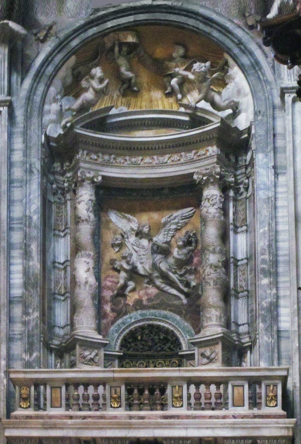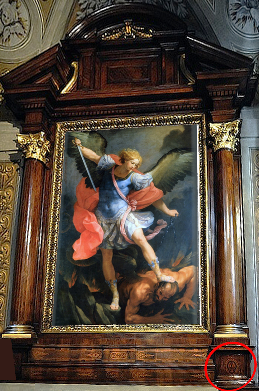 Guido Reni (1575-1642), St Michael the Archangel, c.1635, o/c, 115 2/5 x 79 1/2 ins (293 x 202 cm.), & detail of pedestal; Santa Maria della Concezione dei Cappuccini, Rome. Photo: Kelly Medford