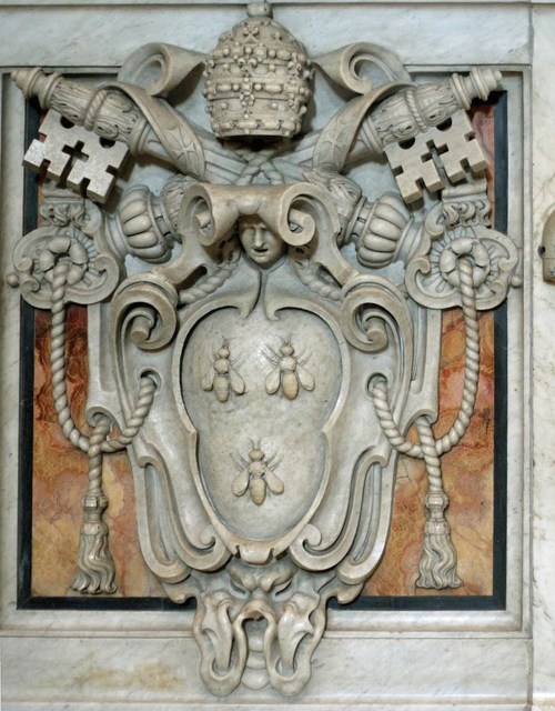 Impresa of Urban VIII, incoporating Barberini coat of arms with papal insignia; pedestal of a column in the baldacchino