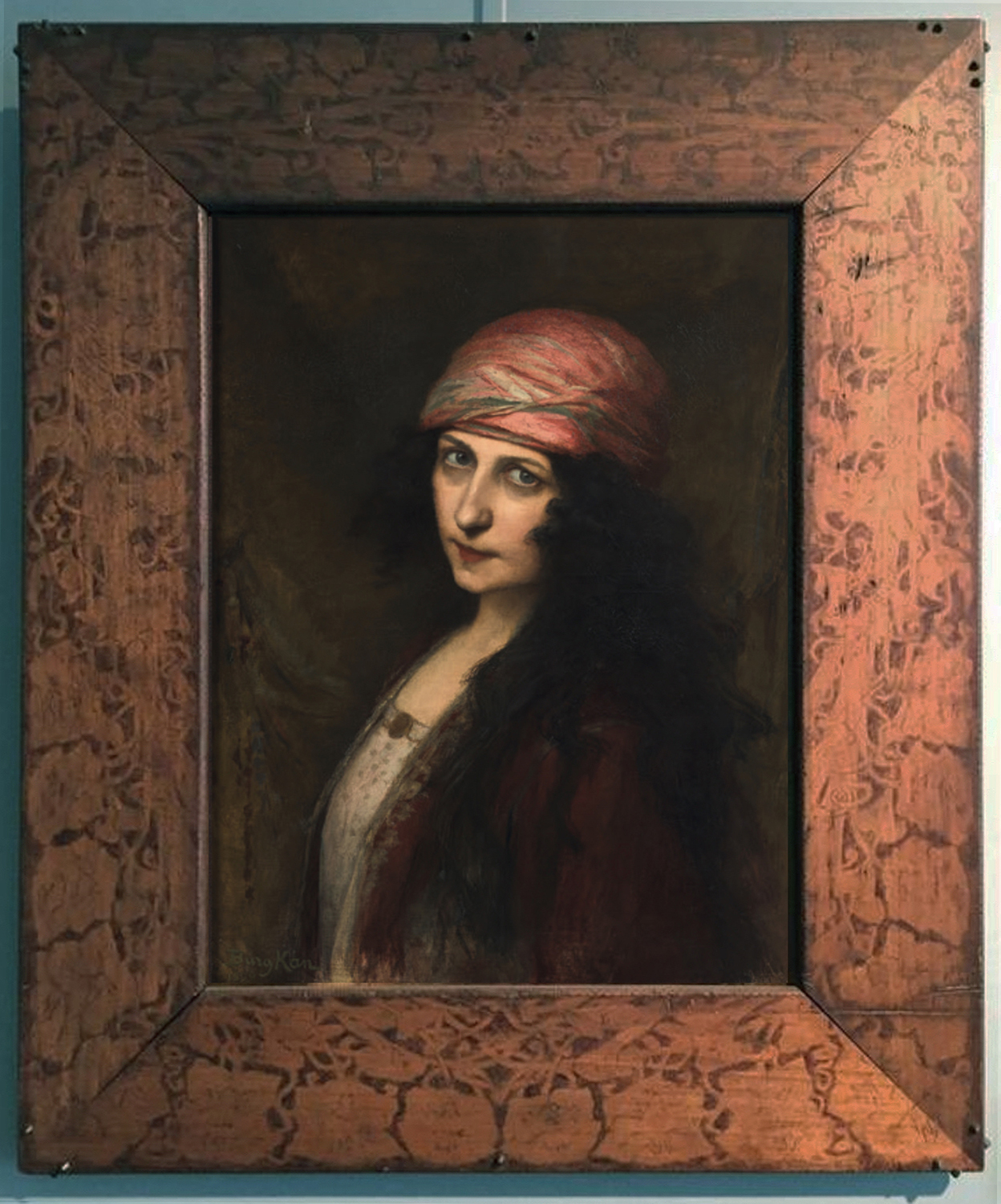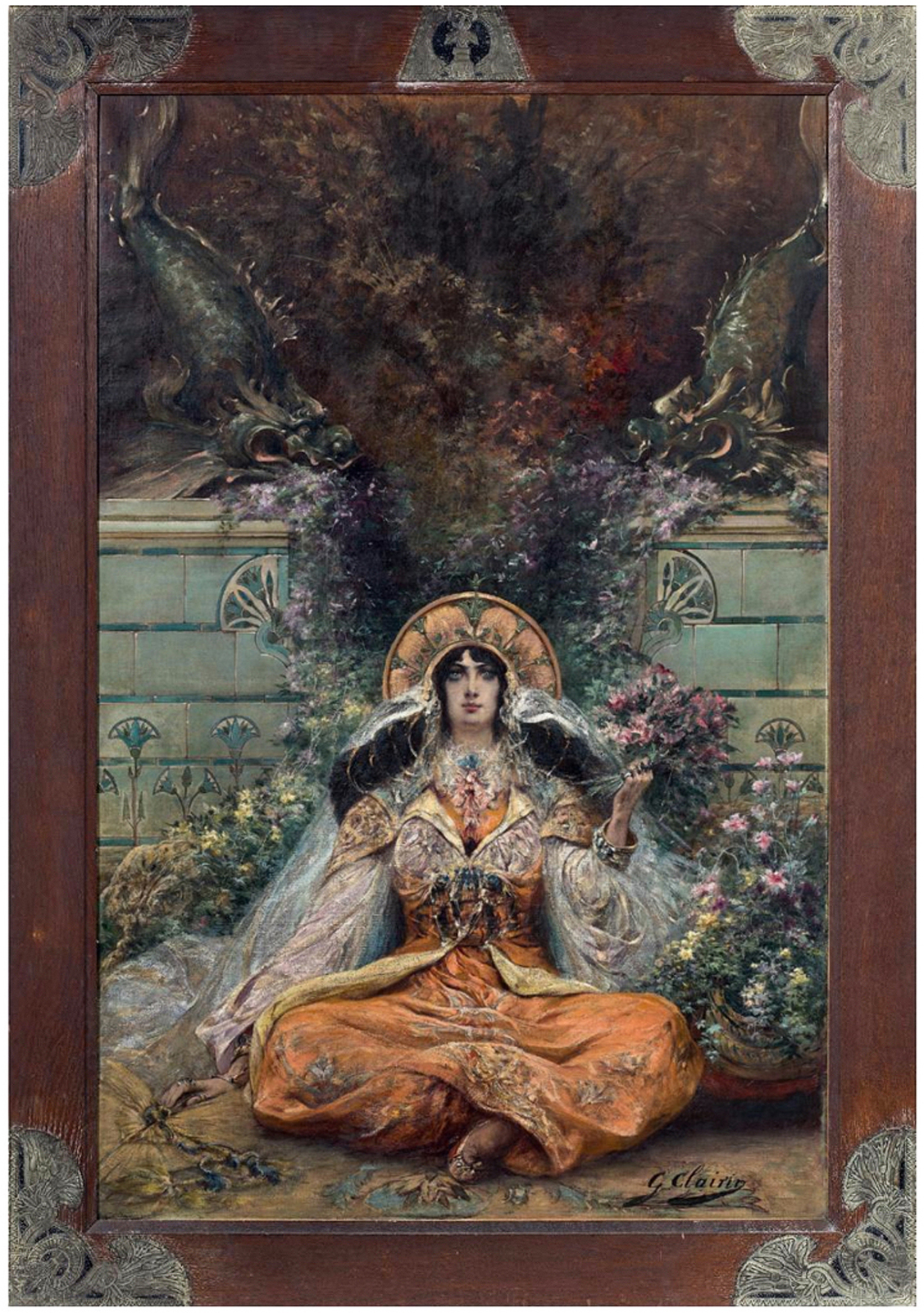 Georges Clairin studied with François-Édouard Picot (who also trained Gustave Moreau twenty years earlier), and in the École des Beaux-Arts; he later travelled in the company of his friend Henri Regnault, and with Gérôme, two notable Orientalists who designed or chose their own attributive frames for their work. He is noted for portraits of his friend Sarah Bernhardt and for his own Orientalism, both of which are combined in this work.