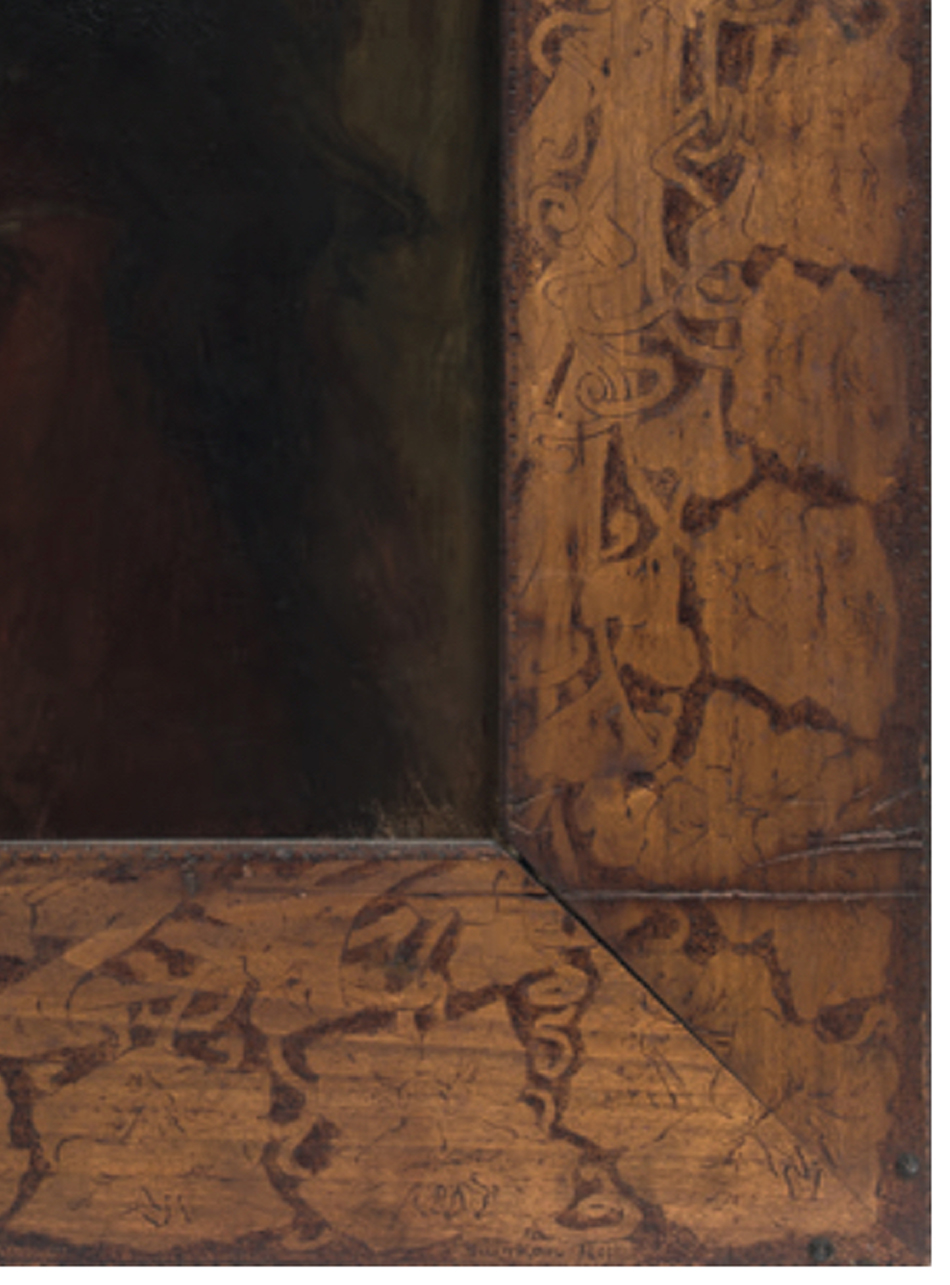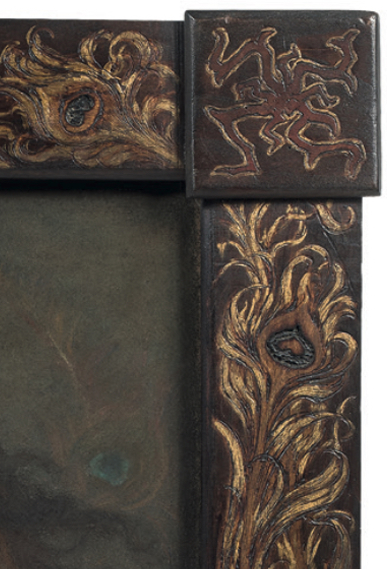 As well as working in both oil and pastel, she evidently also experimented with pyrography – a technique which became very popular in the late 19th and early 20th centuries, when new processes were invented and the effects increasingly refined from the folk art medium of pokerwork. All three of these frames have been decorated to varying extents with pyrography, the most striking probably being the swirling, agitated peacock feathers on the frieze of ‘Le Fascino‘, which repeat the painted feathers in the background of the picture. This is probably the most wholesale intervention by an artist in any of the frames in this auction; it is clear that – although also designed by the artists – most of the others were almost certainly produced by other craftsmen from drawings of greater or lesser elaboration. Berthe Burgkan’s frames are fairly simple in structure, but she has taken their surface decoration into her own hands, and the process she is using is vividly apparent in the ‘eye’ of the peacock feathers, where the heart-shaped centre is clearly burnt into the wood. The feathers are then picked out in gilding, as are the strange knots of twigs or tendrils in the corner outset cassettes.