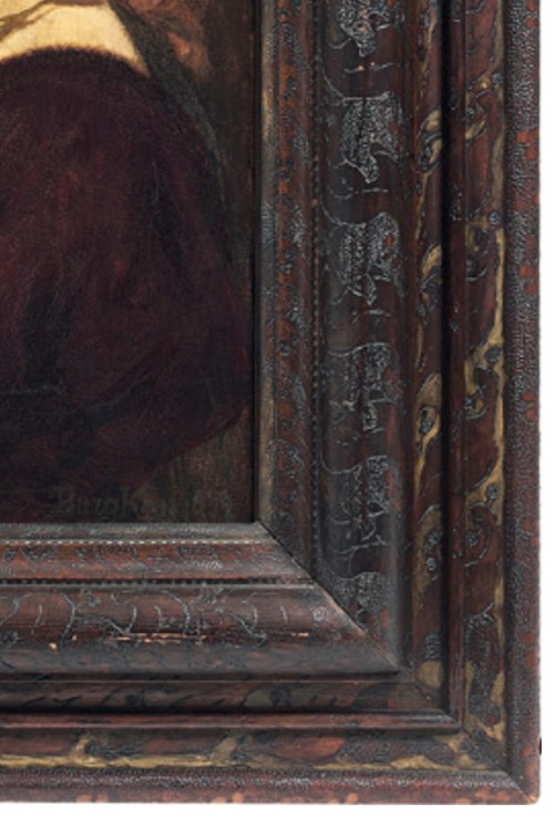 The frame of Laura de Noves (Petrarch’s Laura) has a more sculptural, Baroque form of a bolection moulding frame, which slopes back from the top edge, near the painting, to the wall. It is made of polished dark wood, into which a design of leaves has been burnt – quite ferociously, leaving a lot of evidence of the process, and giving the frame a distressed and time-worn air which the artist evidently wished to correspond with the subject. It is further proof of Burgkan’s willingness to experiment with a different medium to produce a completely integrated work of art.