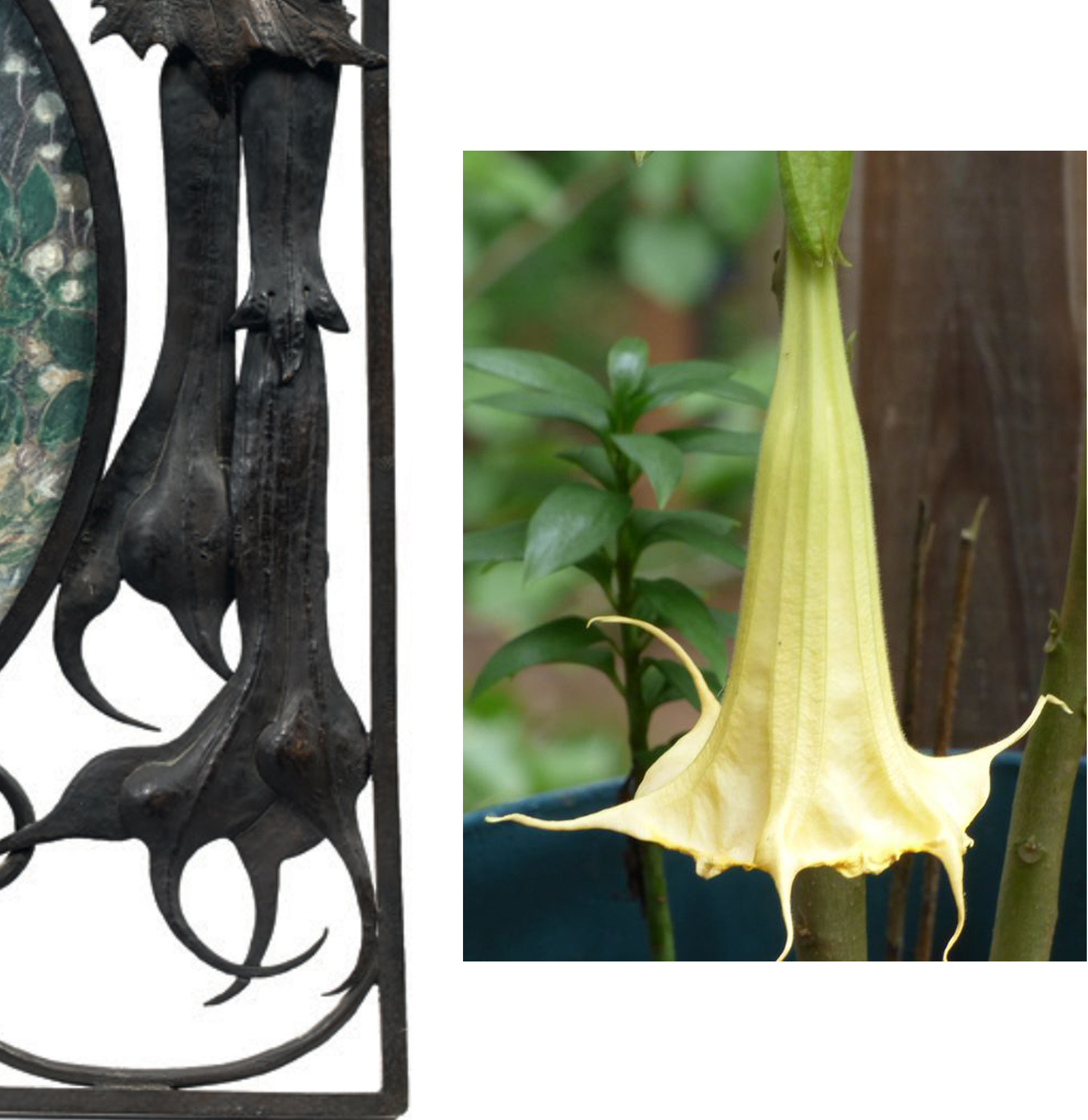 Provided that this is indeed the original frame, then the latter flower might be seen as a camelia, evoking Bernhardt’s rôle in La dame aux camelias; the pendant flowers at the sides may be the lilies that a young Oscar Wilde threw in front of the actress, for her to walk over, or – like the flowers on Berthe Burgkan’s Herodias – they may be ‘angels’ trumpets’.
