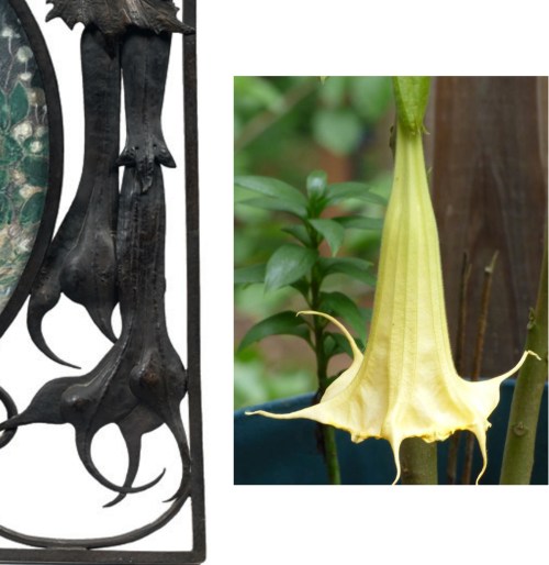 The very simple ‘plank’ frame of Herodias has also been ornamented with twining and flowering vines in pyrography; they are large and trumpet-shaped with prominent stamens, and could either be lilies or datura flowers – ‘angels’ trumpets’.