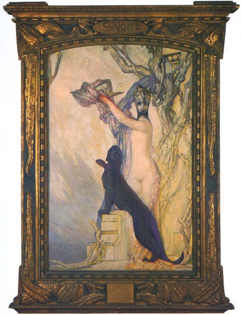 His frames borrow from the same Arts & Crafts/ Art Nouveau sources as Martin’s, but also from a reimagined Renaissance structure and ornament, like Moreau’s, or from a Gothic version, like Edgar Maxence’s. The frame of Douleur de Sapho is much plainer, similar to the leaf of a folding screen; its only ornament is the painted title plaque at the top, echoing the plaque in the entablature of Salome…, above. Like Martin’s Prodigal son, Sapho shares a close stylistic relationship with contemporary furniture.