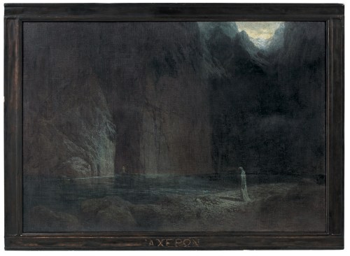 L’Achéron imagines one of the rivers of the underworld, which the dead must cross to enter Hades; Charon, the ferryman, emerges in his boat from the cavernous entrance, on his way to pick up the newly-dead soul who waits in the foreground. This less than jolly subject, rendered even more desolate than Böcklin’s island by its practically monotone treatment, has a frame which reinforces the theme both in structure and in colouring. It has a vestigially aedicular form, rather in the manner of Stuck’s minimalist aedicular frames, but stripped down to an even more skeletal form – pilasters, entablature and predella suggested by panels contained in linear mouldings. The title is incised in Greek letters on the base.