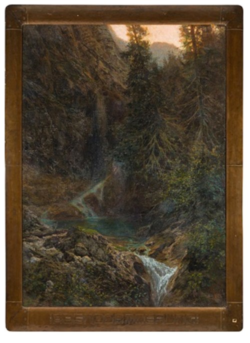 Kuklac was born in Slovenia but studied at the Academy in Vienna, and – rather like Henri Martin – painted Symbolist works in his youth and in a more NeoImpressionist style later on. He became a member of the Wiener Künstlerhaus and the Genossenschaft Bildender Künstler, also in Vienna. The influence of Böcklin on his Symbolist work is most visible in this, of all his paintings, which is clearly indebted to the several versions of The Isle of the Dead (painted from 1880-86); Böcklin was an enthusiast for revival Renaissance and Baroque style frames, and Kuklac was evidently amongst colleagues who were also interested in the presentation of their art.