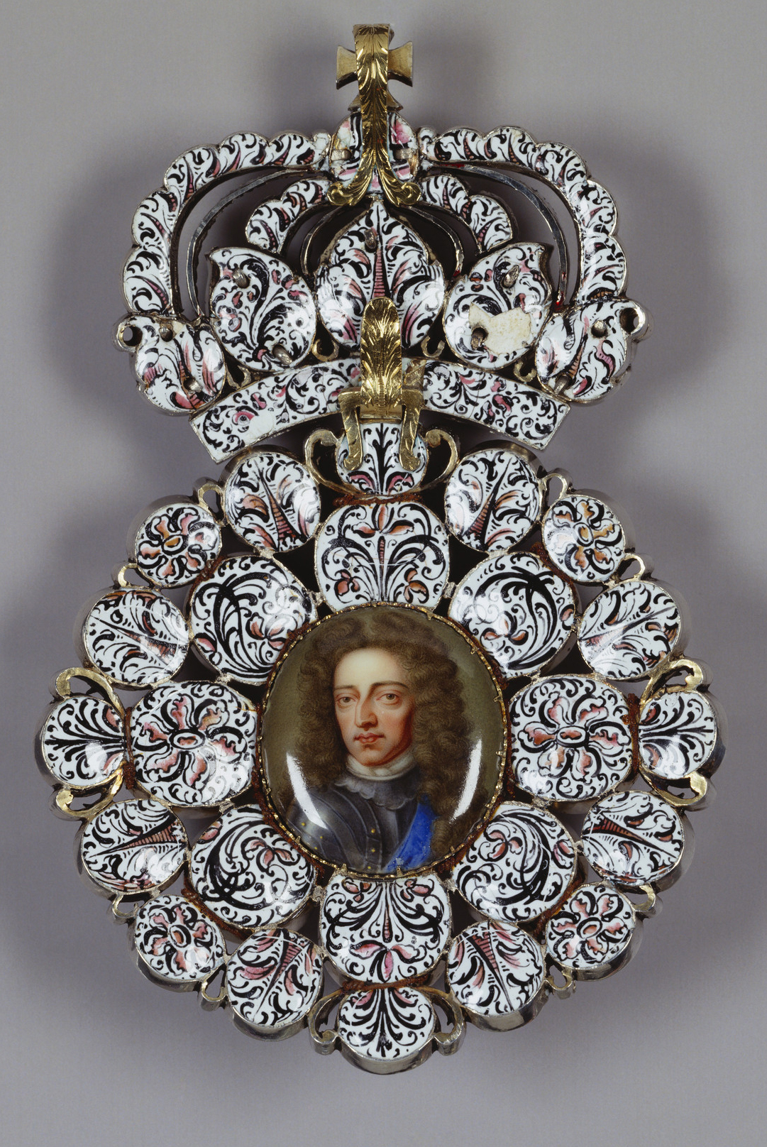 British school, Portrait of William III, c.1690, gold, enamel, silver, rock crystal,10.4 x 6.9 x 2.0 cm. overall; Collections of H.M. Elizabeth II / Royal Collection Trust