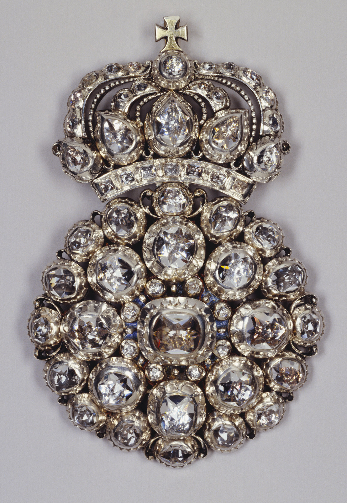 The second belongs to the Gemeentemuseum in The Hague. It was commissioned from the king’s jeweller (from 1676 to 1714), Le Tessier de Montarsy, and presented by the king to Antoine Hensius, Great-Pensionary of the Netherlands; it cost 2648 livres. The jewel still survives in its leather box, but most of the diamonds have been extracted and sold.