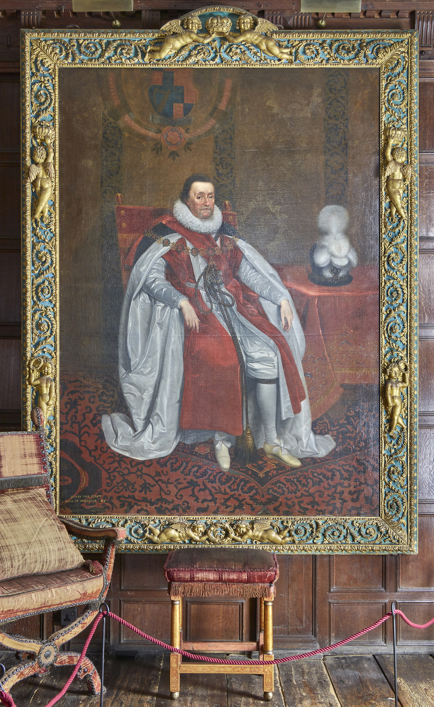 Daniel Mytens (c.1590-1648), James I of England & VI of Scotland, 1620s, o/c, 244.5 x 175.5 cm., & detail; in contemporary (possibly original) frame, gilt on a blue (restored) ground; Knole NT 129891. Photo: Laurence Pordes