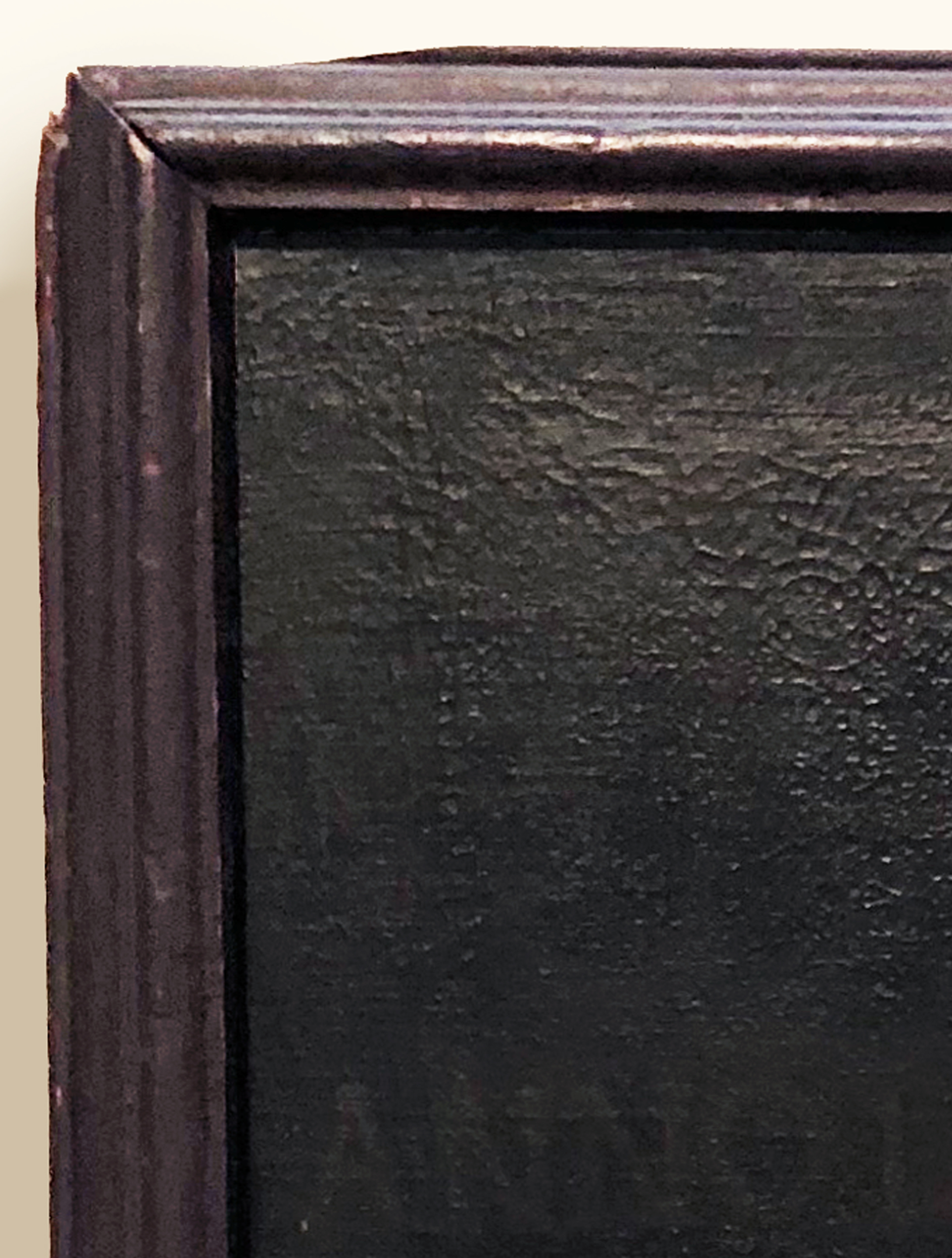 However, the frame of this group portrait is a more sophisticated example of the joiner’s frame than may first appear. Although it is relatively narrow the profile, with its deeply-cut round and hollow mouldings, is looking forward from the flat architrave and entablature frames of Renaissance Britain to the complex plastic forms of the Baroque (if not to their ornamentation and gilding); and the finish, which is now painted a puritanical black, was once coloured green, possibly in two shades (other works by the Freake-Gibbs painter which apparently retain similar early settings may on inspection have been reframed).