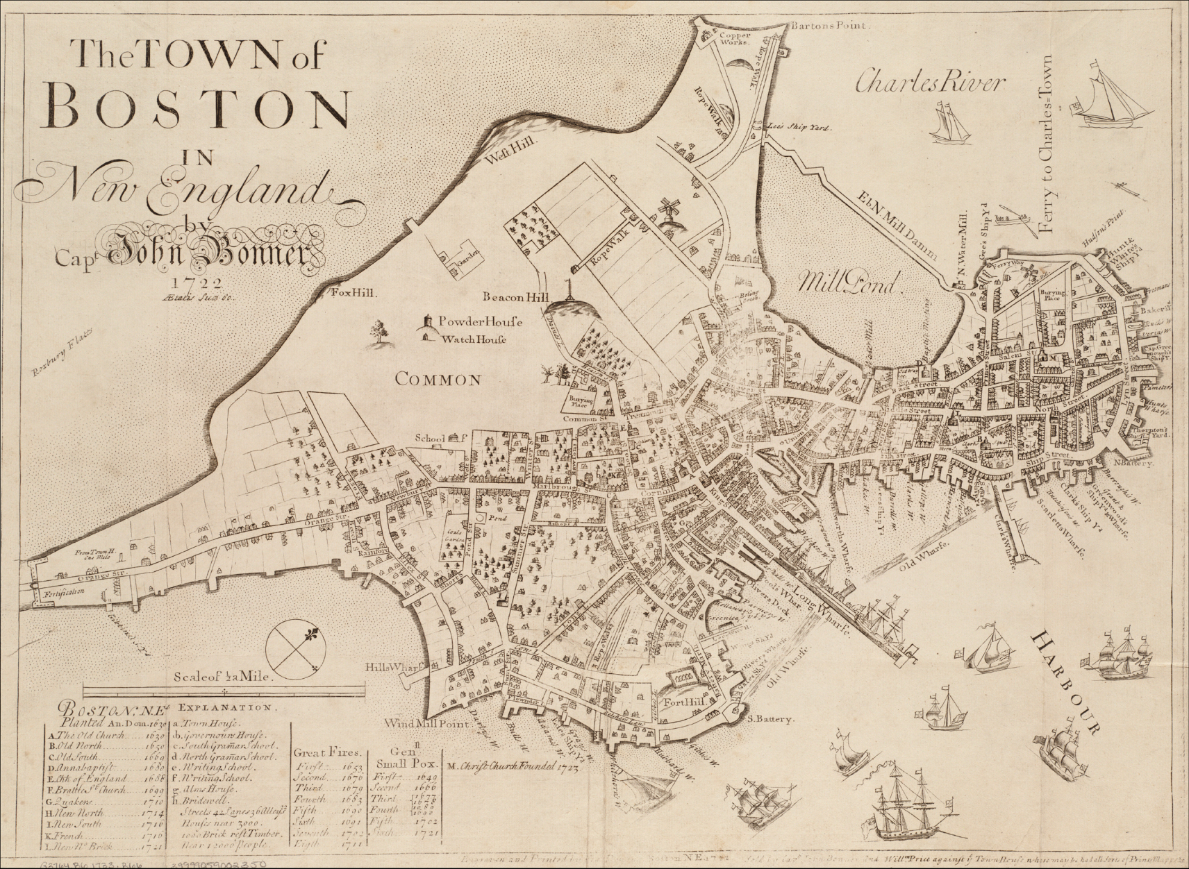 Map of Boston by Captain John Bonner, 1722, The West End Museum, Boston