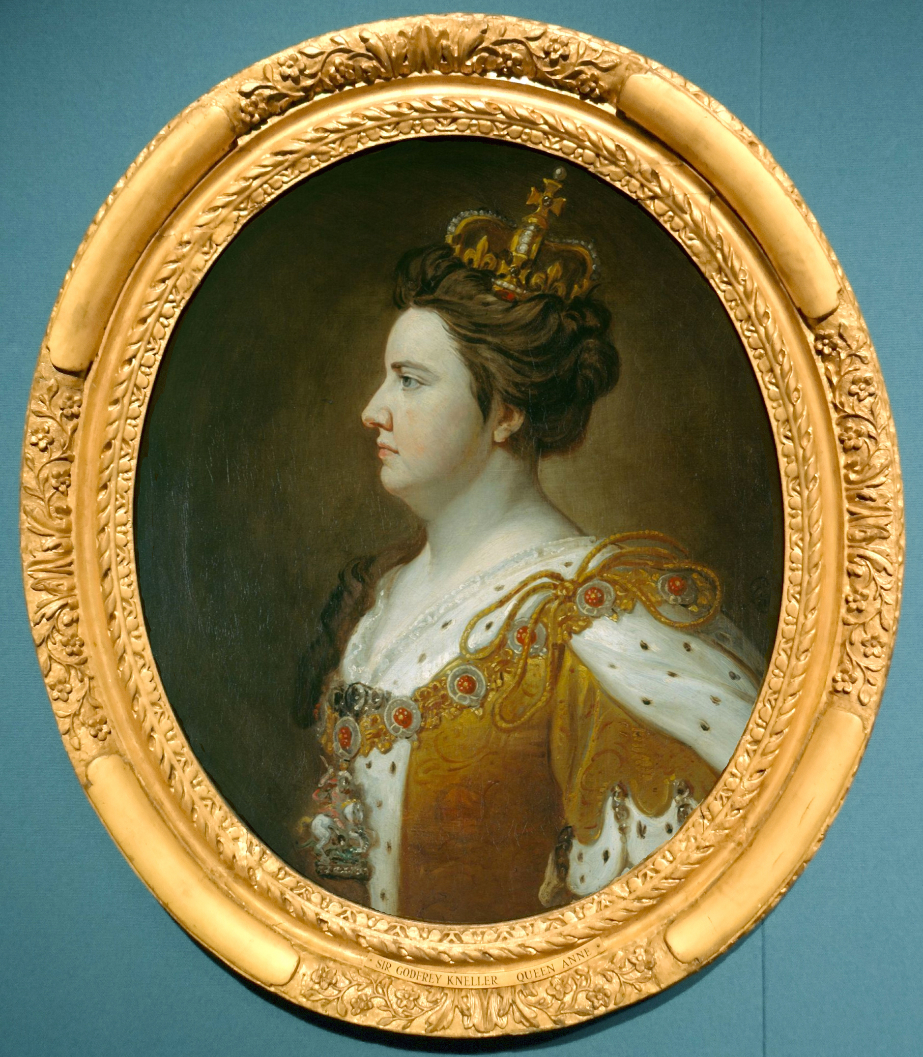 Sir Godfrey Kneller (1646-1723), Queen Anne, c.1702-04, in British oval panel (‘Lely’) frame, Royal Collection RCIN 405614