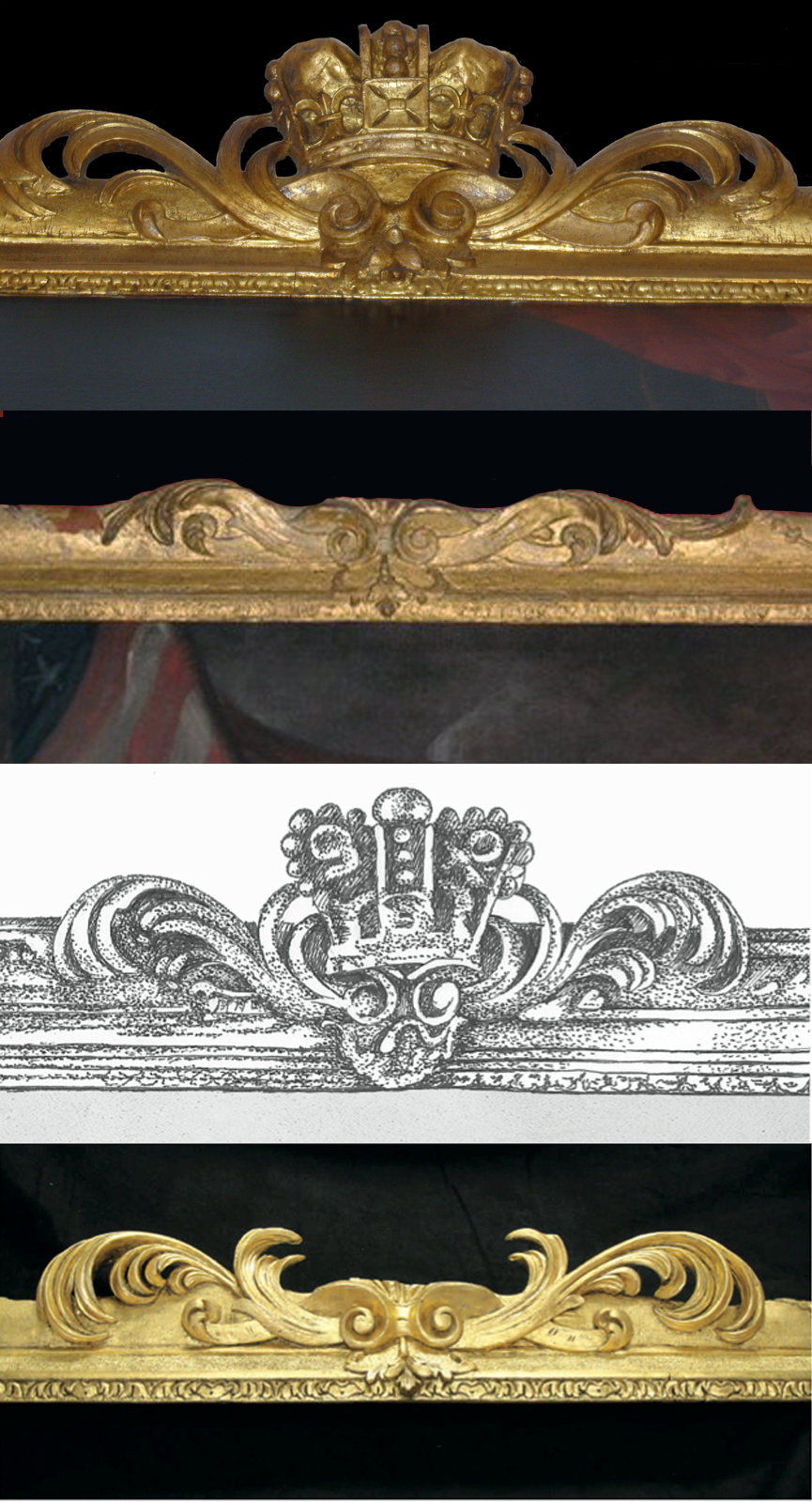 By the 1710s, early types of colonial carved and gilded frames are represented by versions of French and British Louis XIII styles, including a later incarnation of the garland frames used for the portraits of John Freake and his wife. Some of them may have been made in London, and imported to serve as templates, but it is probable that by this point they were being produced in America – in the case of the patterns above and below, in Boston [15]. Both these types of frame contain portraits of Queen Anne by the mysterious artist J. (perhaps John) Cooper. His work is found both in England and America, and in the latter within historic collections (such as that of Yale Univsersity), where in some cases his paintings have been held almost since they were finished, indicating that he lived and worked in both countries.