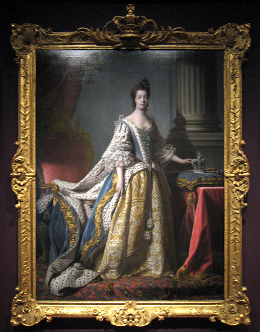 The frame in this case was evidently chosen as a design which could be considered appropriately opulent for a monarch and was also still fashionable in Europe, whilst being both ornamental and easy to reproduce. Like the painting itself, the carving is quite schematic and stylized. The oval form may be partial assurance that it was made in Boston rather than London, to fit the canvas of the portrait; this form was also influenced by the trompe l’oeil frames used in the prints.