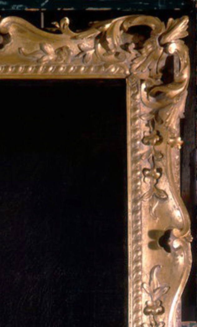 Other colonial versions of Louis XIII-style carved and gilded frames include the Anglicized panel frame (sometimes known as a ‘Lely’ frame by association with his work). This developed from the French Louis XIII convex moulding decorated with shallow-relief foliated strapwork and flowers, combined with the composition of the contemporary ‘flower corner’ pattern, also French, which together were flattened and simplified into an arrangement of ornamental carved panels alternating with plain reposes or ‘mirror panels’. The advantage of this design was that it required less carving, less labour, and thus less expence, whilst reaping the benefits of a corner-&-centre frame, where the emphases of the carved panels create focal lines which enhance the compositional lines of the painting.