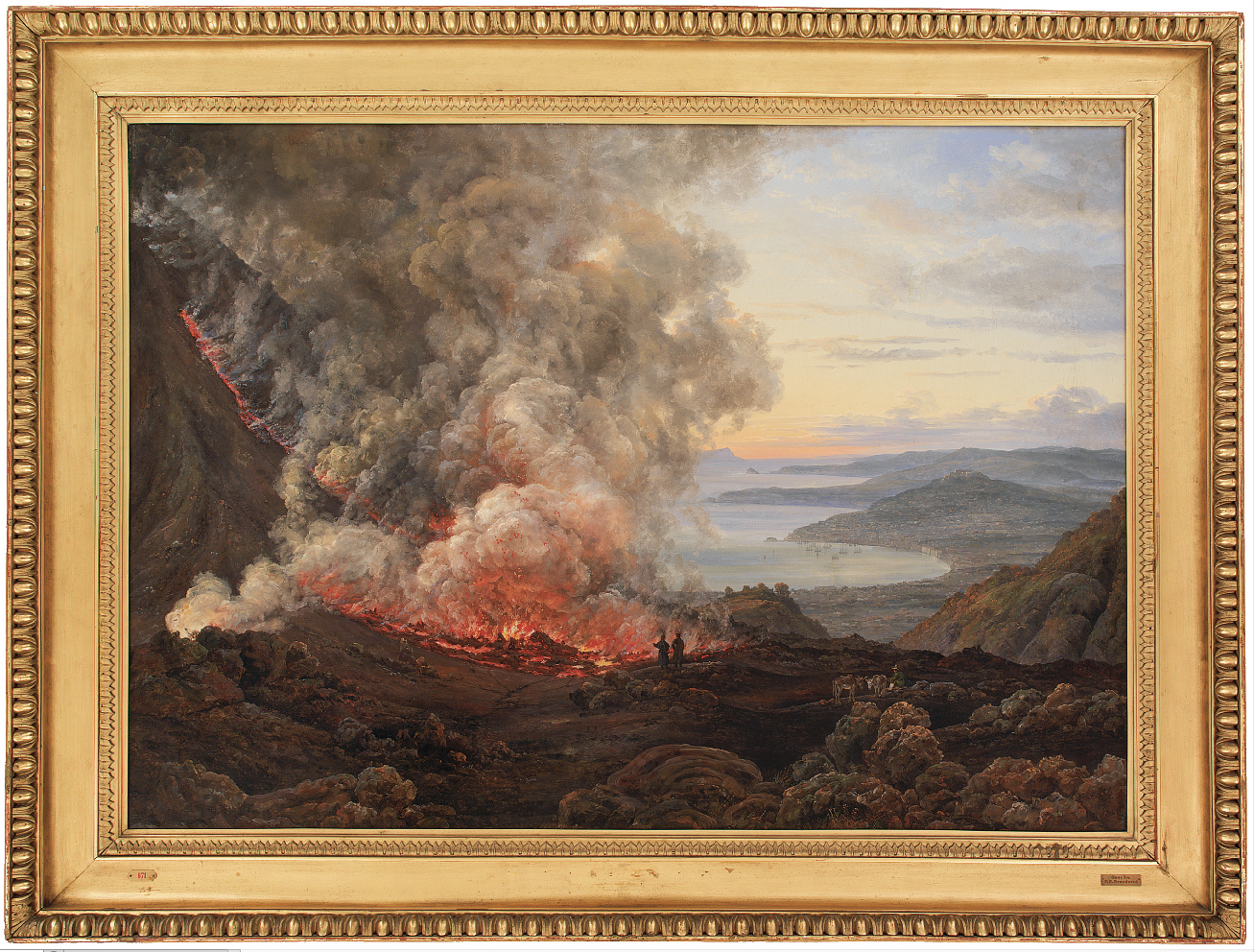 Their frames are mainly in a simple although rather heavy Empire style; a notable exception is the elegant contemporary frame of J.C. Dahl’s Eruption of the volcano Vesuvius, with its finely-carved egg-&-dart moulding, possibly from a Roman framemaker.
