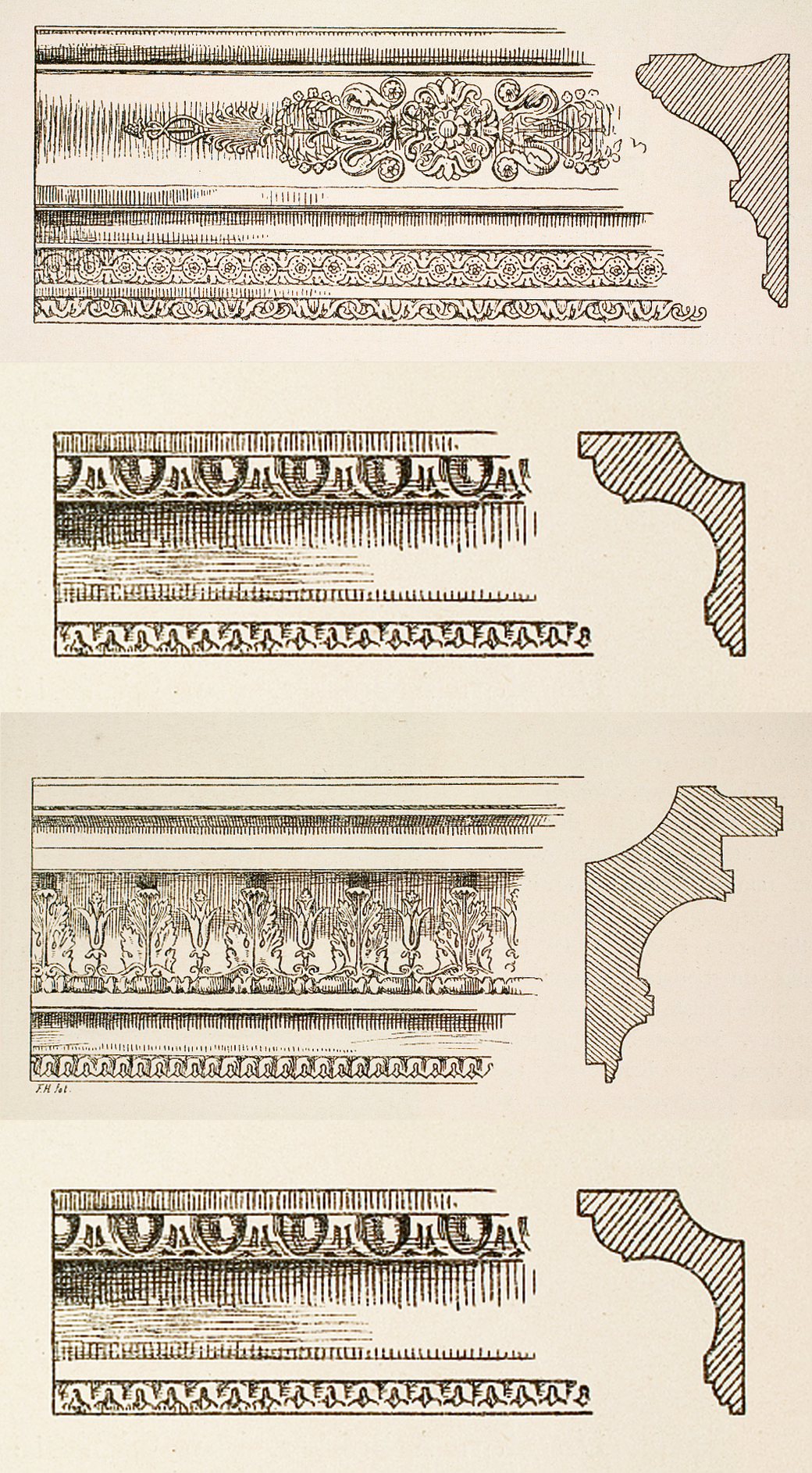 Symmetry and linear forms were basic elements of the Empire style; and the moulded compo frame offered a flexible range of variations on the basic theme. This included different profiles and widths of the rail, which could be ornamented with pearls, astragal-&-bead, a fluted scotia, dentils, Greek fret, ovolo chain and stopped-channel fluting, amongst other motifs.