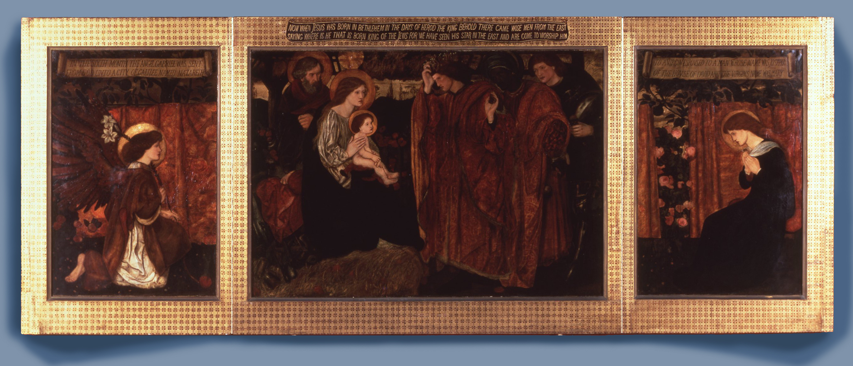 Edward Burne-Jones (1833-98), The Adoration of the kings & shepherds triptych, second version: 1861, o/c, plus centre panel, and detail of that panel (top left-hand corner), private collection