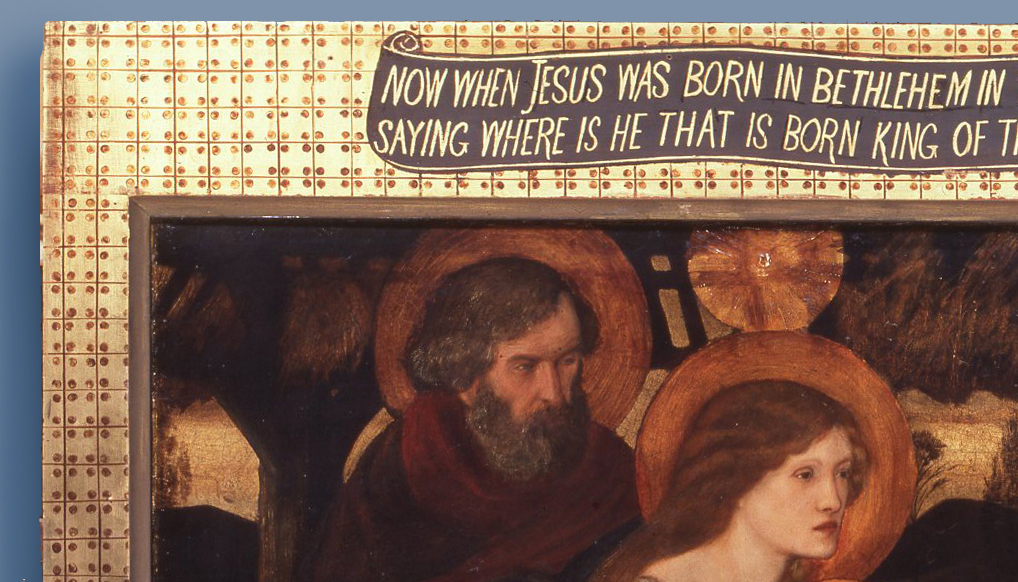 This second triptych, framed and installed in the church on its completion (also in 1861), had each panel set in a flat, smoothly-gilded border painted with a grid of black lines and dots. This is very much in the style of the painted furniture Burne-Jones had produced with Morris in the 1850s, which is Pre-Raphaelite in its very simplified structure, and a cross between re-imagined mediaevalism and embryonic Arts & Crafts in its ornamental details and decorative finish. It is quite as avant-garde in its way as the earliest frames designed for their work by Ford Madox Brown, D.G. Rossetti and Holman Hunt.