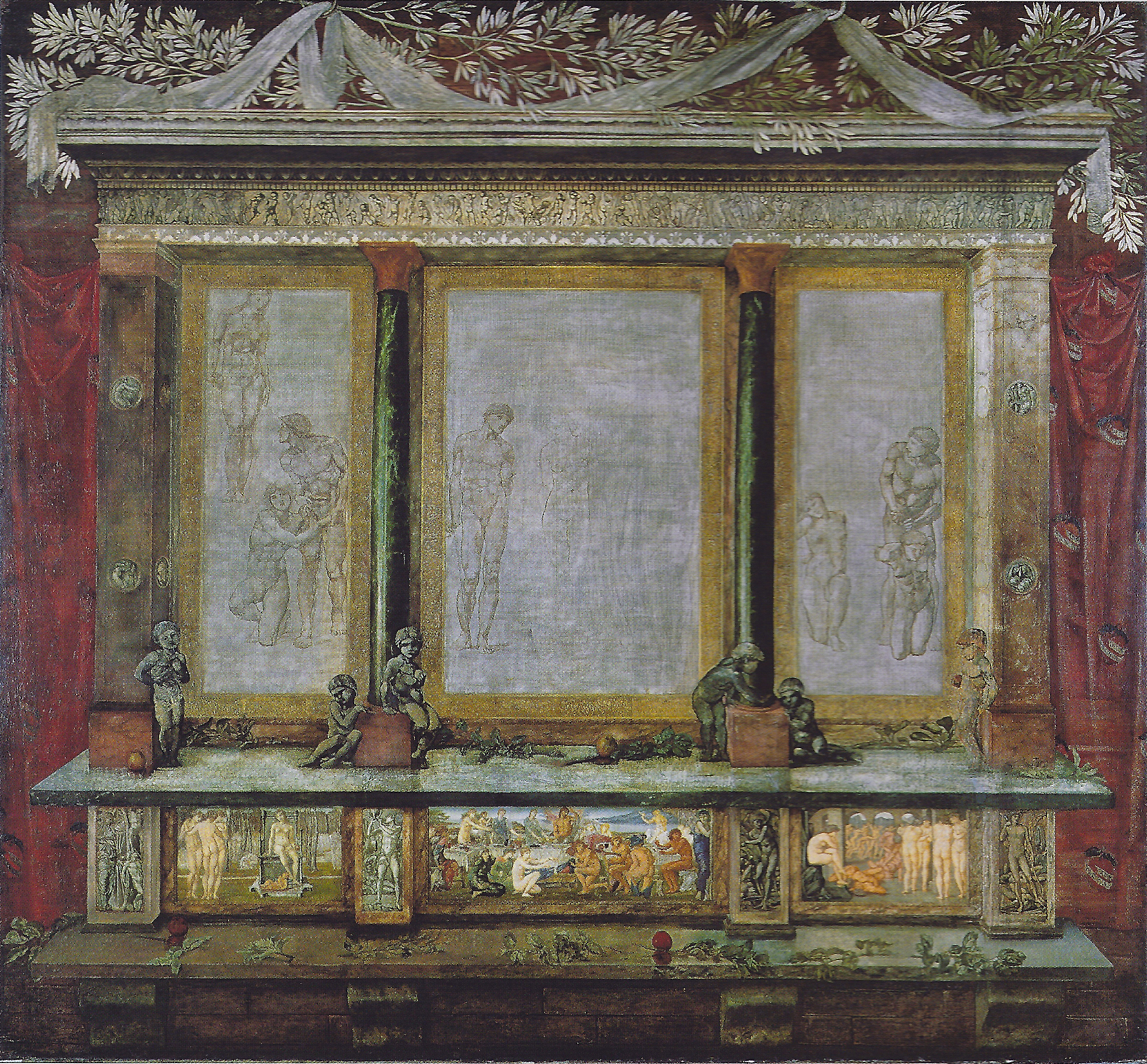 Burne-Jones follows Mantegna in creating a deep predella with painted scenes set between decorative dividing panels; his fictive frame is coloured as well as gilt, and the classical entablature sports a shallow-relief ‘Frieze of Babies struggling’, based on the frieze of putti decorating the internal space of Mantegna’s altarpiece. He eschued the segmental pediment and acroteria which crown Mantegna’s frame, and replaced its outer columns with square pillars, also adapted from those in the fictive architecture within Mantegna’s picture.