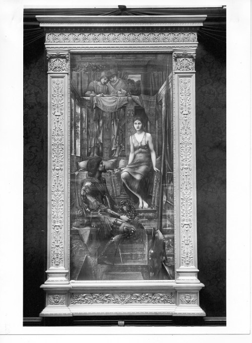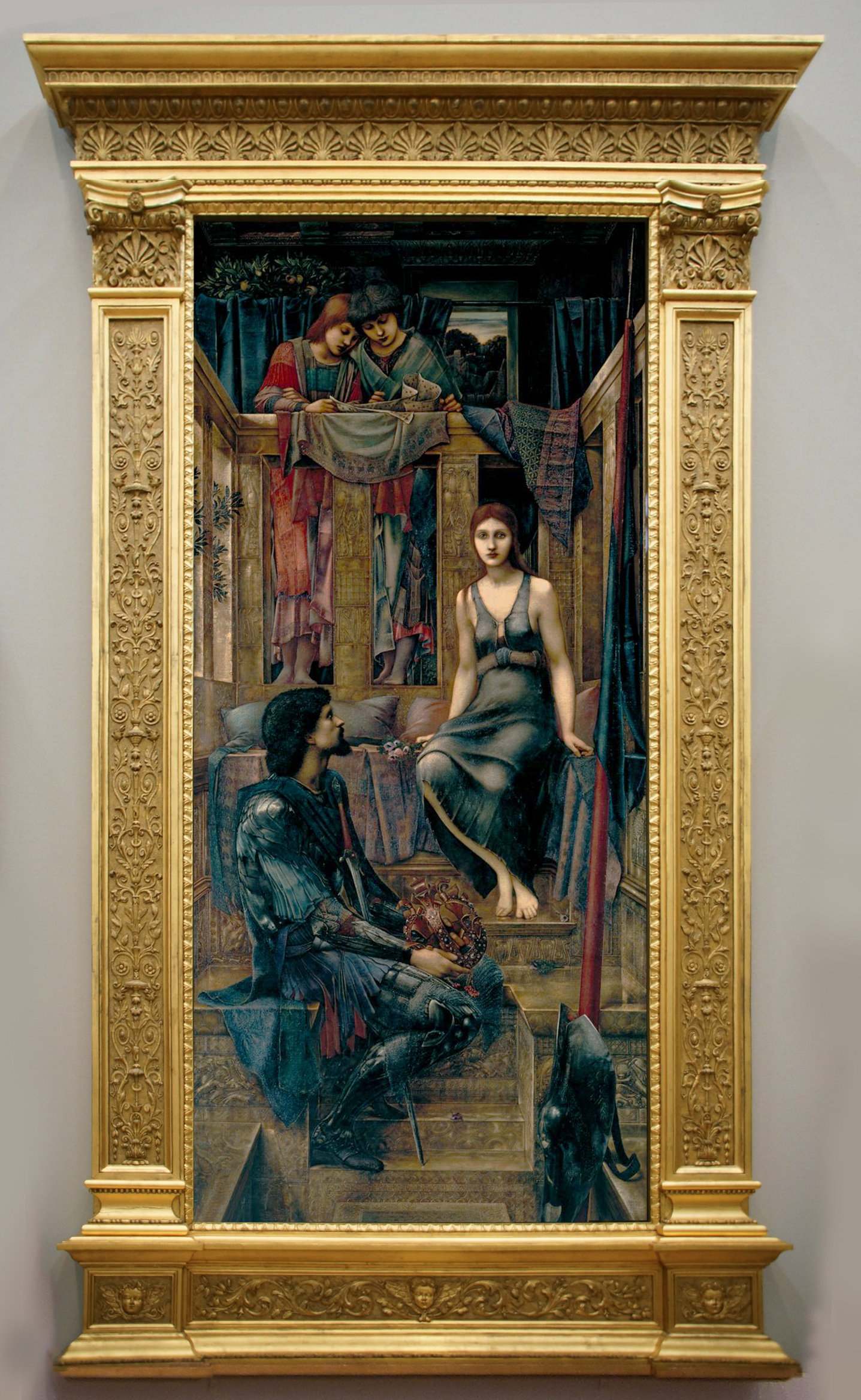 The Renaissance theme introduced by The story of Troy informed several different settings used by Burne-Jones for paintings from the 1870s to the 1890s. One is his own version of a late 16th-early 17th century carved and pierced Venetian style frame, used for instance for The beguiling of Merlin.
