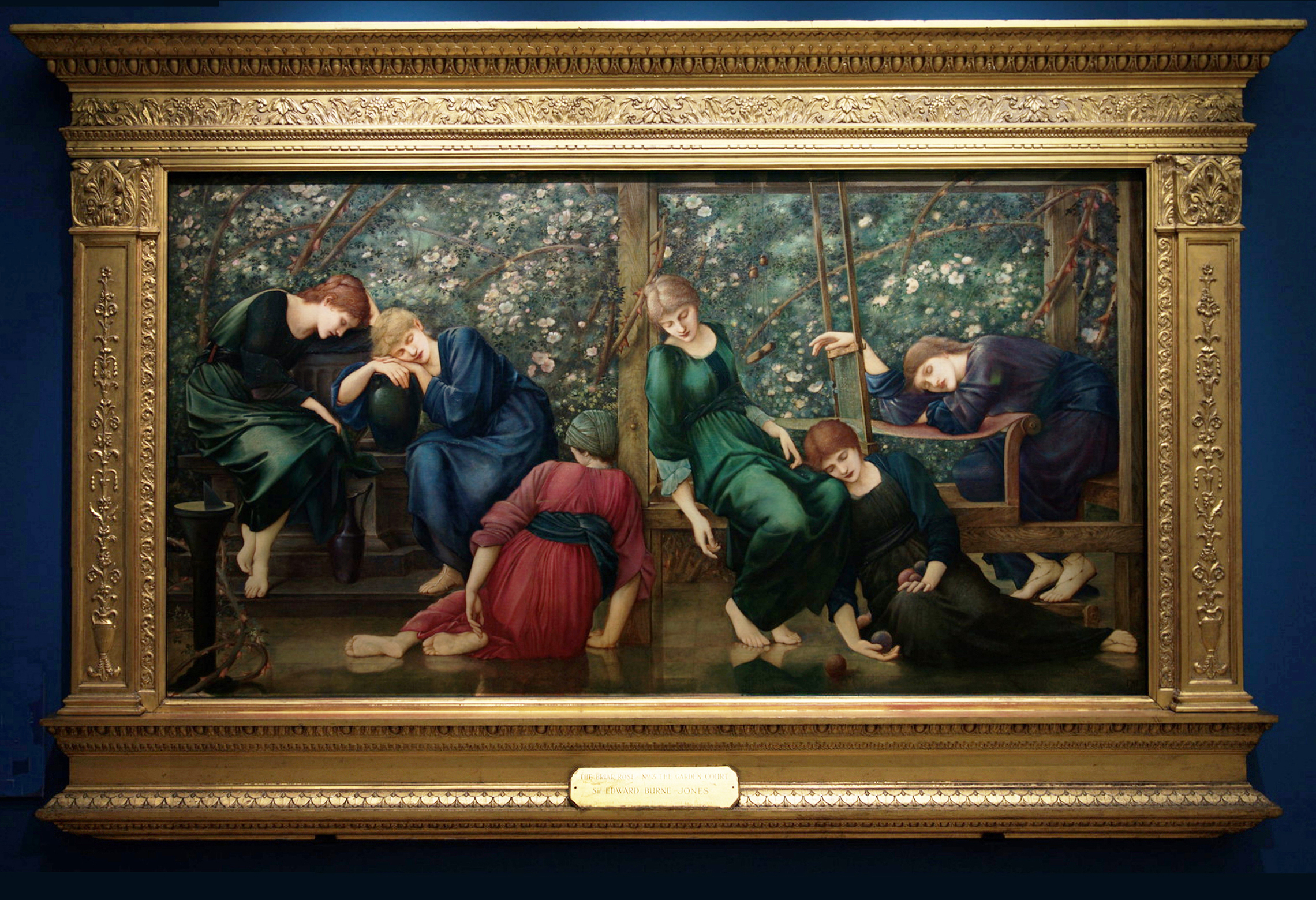 Edward Burne-Jones (1833-98), The legend of Briar Rose: the Garden Court, from the third series of works on this subject, finished 1894, o/c, 126.3 x 237.4 cm., & detail, Bristol City Museum & Art Gallery