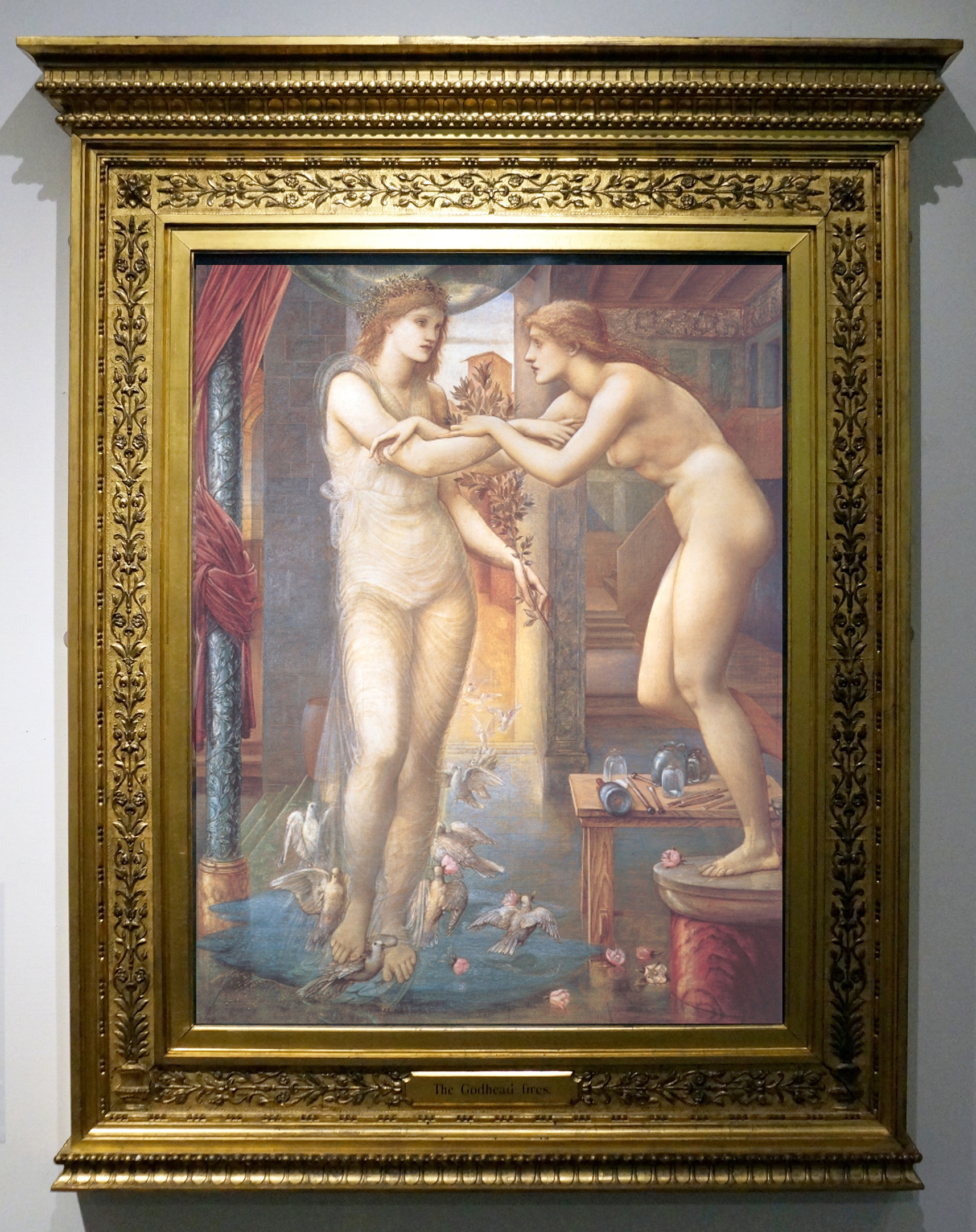 Unfortunately, however, Burne-Jones’s father was not the most competent of framemakers, and the bay-leaf astragals around the pendant, Clara von Bork, have had to be replaced. As Georgiana Burne-Jones noted,