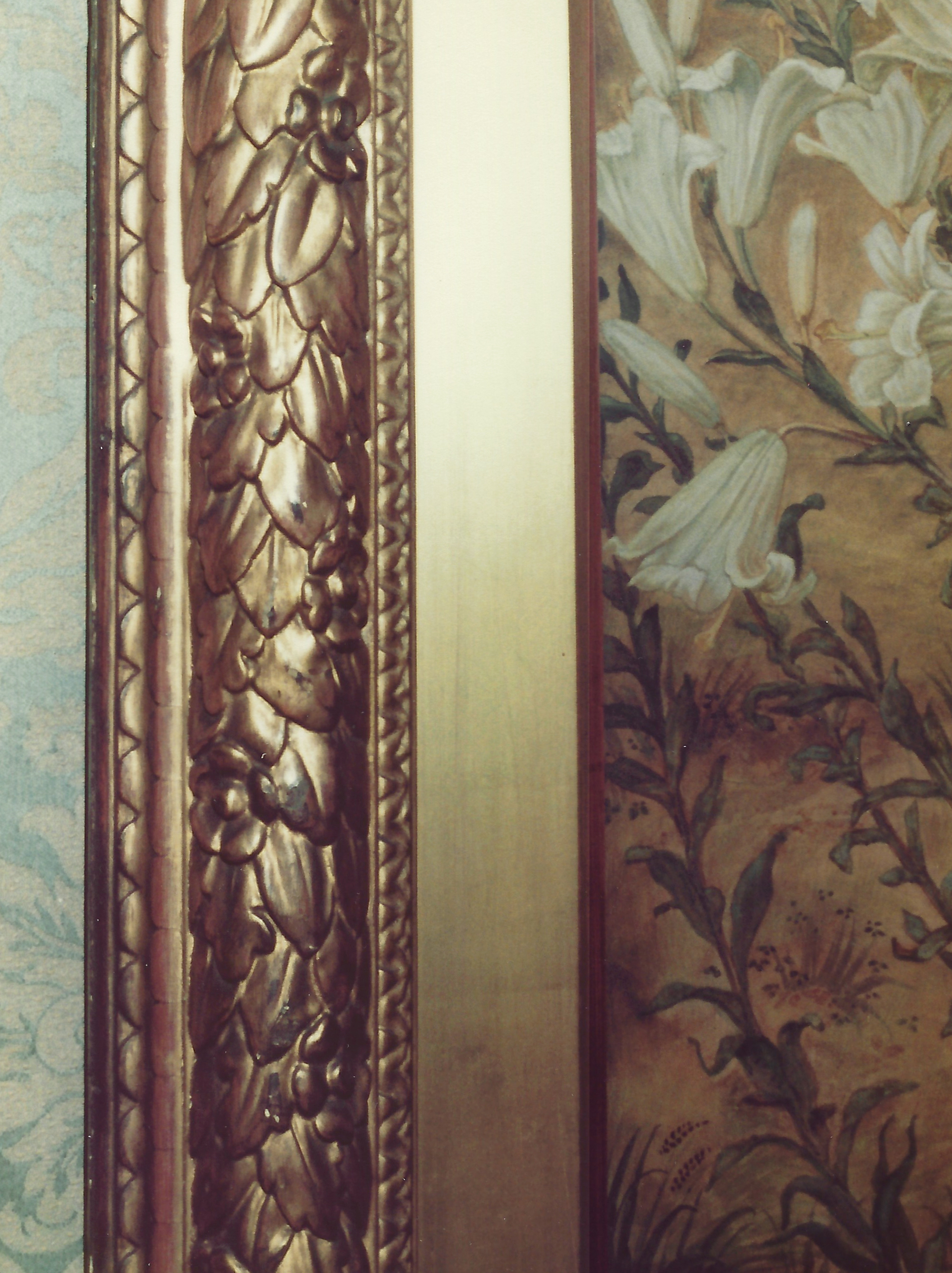 The main features of their designs were wide flat friezes, broad giltwood inlays with oversized bevels at the sight edge, inset ornamental roundels, and the use of vertical butt joints rather than mitres. From 1861 the inlays or mounts were gilded directly on the wood, rather than over gesso, in what must then have seemed a surprising revelation of the texture and grain of the oak. Rossetti’s ‘thumb-mark’ pattern was also introduced – an outer frame of triangular section with alternating indented semi-circles. A further development was the repetition of the oversized bevel on the back edge of the frame itself.