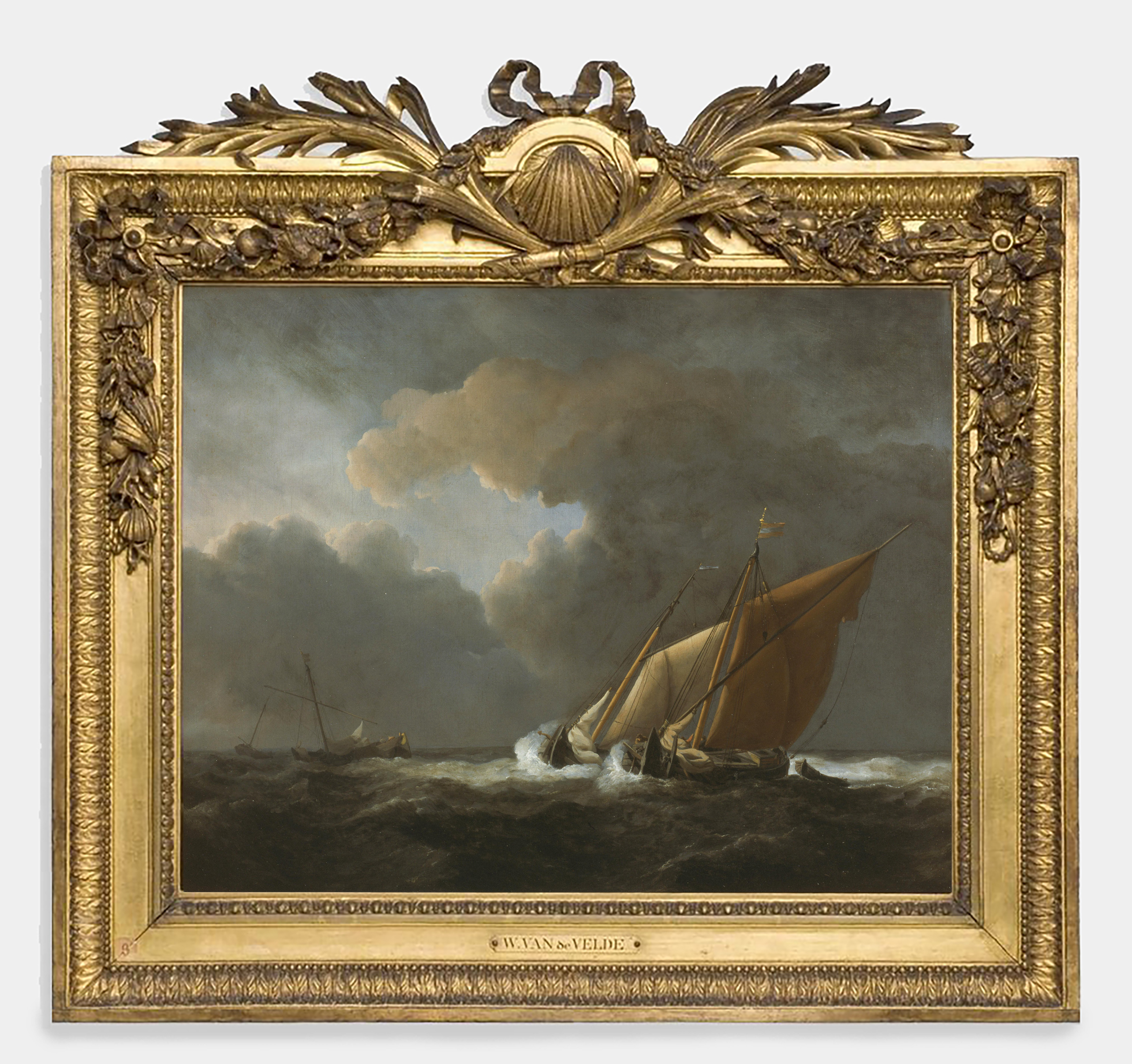 Willem van de Velde II (1633-1707), Two Dutch vessels close-hauled in a strong breeze, c.1672, o/c, 43.8 x 55.7 cm., in French NeoClassical carved giltwood frame with scallop shell, palm leaf and ribbon crest, and festoons of naval trophies and seashells, c.1780, presumably commissioned specifically for this painting; cat. 51, Philadelphia Museum of Art