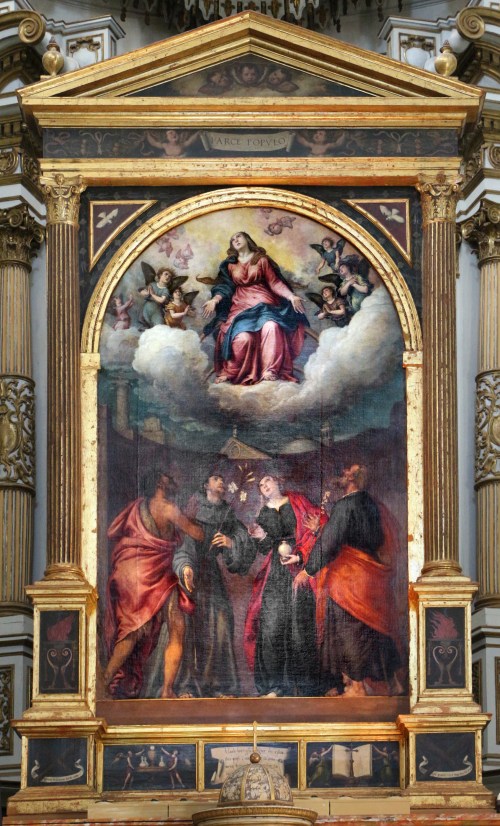 FB: For me, one of your photos that I was really happy to find was this one, above, of the Assumption of the Virgin, painted by Il Volterrano when he was only twenty. I wanted it for an article on the painter to show his early work, and also because his father was a sculptor and woodcarver, and may have made this frame for his son’s altarpiece – thus possibly launching him into a career which included a great many designs for moveable frames, as well as wall and ceiling frescos with integral painted borders. The picture was commissioned for the cathedral of Volterra, moved to the Oratory of Sant’Antonio Abate, and is now in the Diocesan Museum; however, you found it, and took a really good photo of it (please forgive the fact that I have tweaked it in Photoshop – sometimes I need to straighten images because the pictures were evidently hung impossibly high, above even your reach).