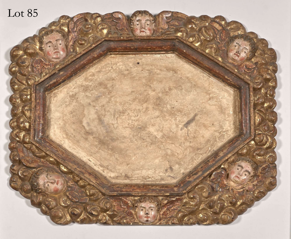 Lot 85: 16th-17th century octagonal carved walnut frame, parcel-gilt and polychrome, possibly for a votive offering; with six cherubs’ heads set amongst stylized cloud, fruit or floral shapes, overall 39.5 x 49.5 cm; estimate €1,200 – 1,500