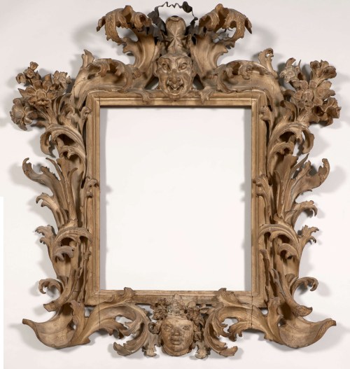 Lot 86: late 17th-early 18th century Italian Baroque leaf frame; highly sculptural, pierced, undercut & carved in deep relief with scrolling and intertwined acanthus branches, supporting posies of flowers at the top corners; with a male mascaron crowned with a star & ornamented with a metal ribbon at the crest, and a female mascaron crowned with flowers at the bottom (possible representing Winter & Summer); finished with a grey wash; 73 x 59.5 cm; estimate €10 – 15,000