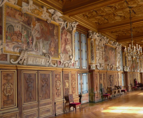 Fictive frames in actual interiors in the region can be found in, for instance, the Palazzo Thiene, built in Vicenza from 1542 to c.1558 by Giulio Romano and Andrea Palladio. The interior is decorated with painted ceilings, and in one room has a deep frieze running around the top of the walls where history paintings in the style of Giulio, and set in trompe l’oeil Mannerist frames, alternate with faux sculptured caryatides.