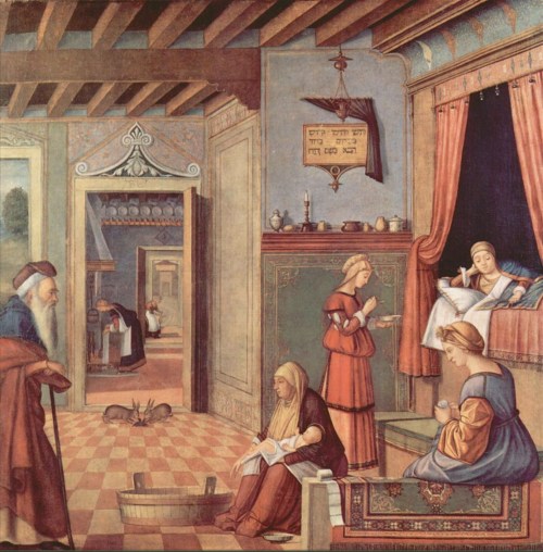 Vittore Carpaccio (c. 1465-1525/26), The birth of the Virgin, c.1502-04, o/c, 126.8 x 129.1cm., & detail, Accademia Carrara, Bergamo