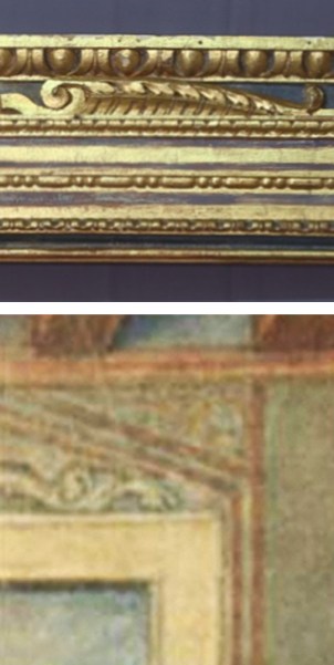16th century Venetian Mannerist frame acquired for The death of Actaeon (top); detail of fictive frame in Carpaccio, The birth of the Virgin (bottom)