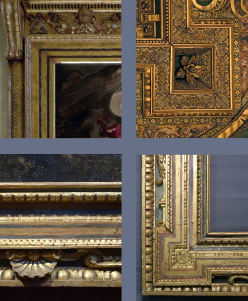 Elements of 16th century Venetian framing: top row: Titian, The Annunciation; outset corner of frame, Tintoretto, The brazen serpent; both Scuola Grande di San Rocco; (bottom row) details of frame acquired for Titian, The death of Actaeon, National Gallery