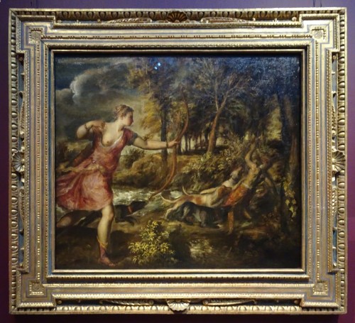 [4] Titian’s Death of Actaeon came to Britain in 1636-38, but was bought from the owner’s posthumous sale in 1649 by Archduke Leopold Wilhelm of Austria, & appears in some of the paintings by David Teniers the Younger of the Archduke’s gallery in Brussels in a variety of imaginary frames. By 1721 it was in the Orléans collection in the Palais Royal, and, like another major work from that collection in the National Gallery, Sebastiano’s The raising of Lazarus, was back in London by 1798. Unlike the Sebastiano it was bought by Sir Abraham Hume, descending to the 3rd Earl Brownlow in 1867; it was bought by the 6th Earl of Harewood in 1919, sold by the 7th Earl in 1971, and eventually acquired by the National Gallery through a public campaign (see Wikipaedia for the entire provenance https://en.wikipedia.org/wiki/The_Death_of_Actaeon ).
