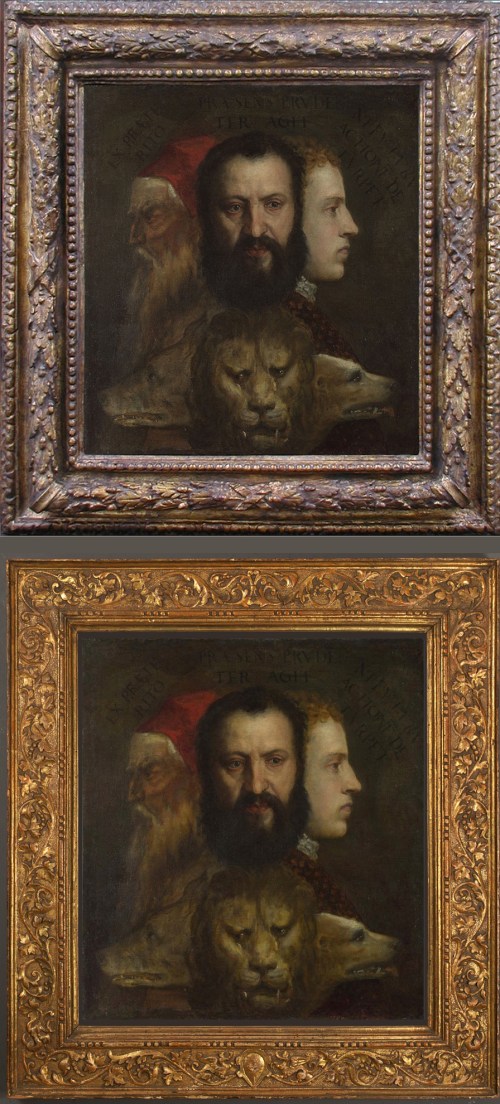 Titian (c.1490-1576), ) & workshop, An allegory of prudence, c.1550-65, o/c, 75.5 x 68.4 cm; before (top) & after; National Gallery.  NG 6376