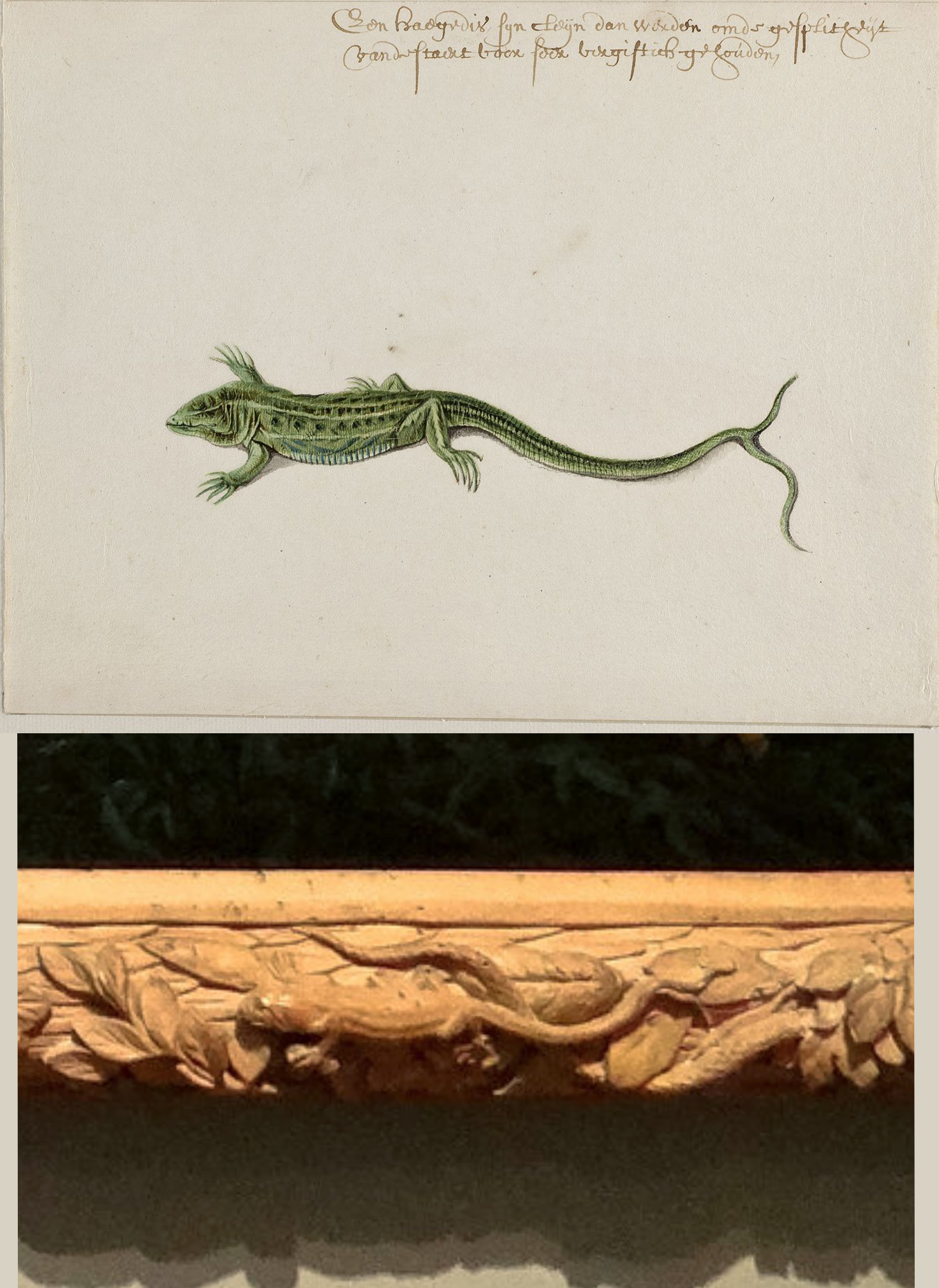Frans Jansz Post (1612-80), watercolour of lizard, c.1638-44, Noord-Hollands Archief, Haarlem; and detail of lizard from frame