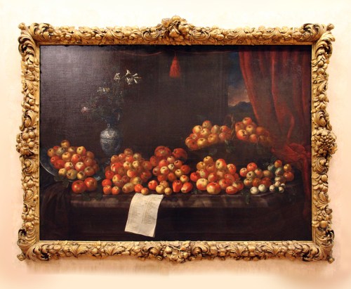 Bartolomeo Bimbi (1648-1729), Still life with apples, 1696, frame by Vittorio Crosten (fl.1669-1704), and detail with of list of apples depicted; Museo della Natura Morto, Villa Poggio a Caiano, Florence. Photo of detail: Federmanager Toscana